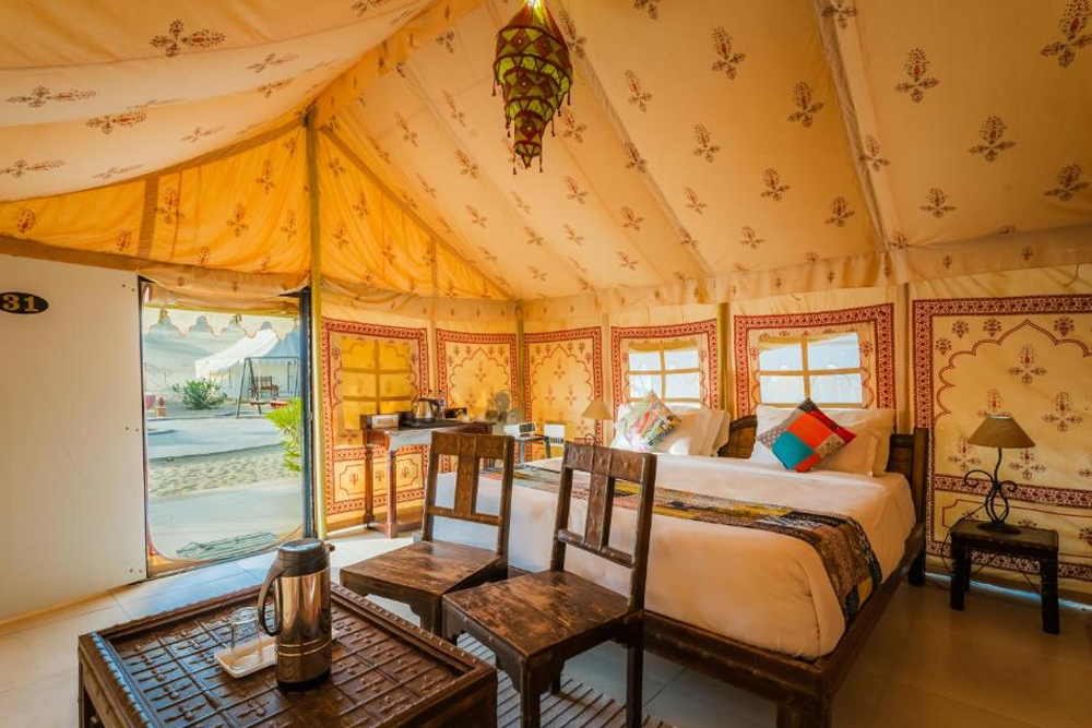 People have really amazing experiences at this resort that happen naturally due to the beauty of the resort. Jeep and camel safaris take guests far into the dunes, and evenings are spent with folk music, local dance, and a fire under the open sky. As an authentic desert camp in Jaisalmer, nothing feels rushed or artificial.