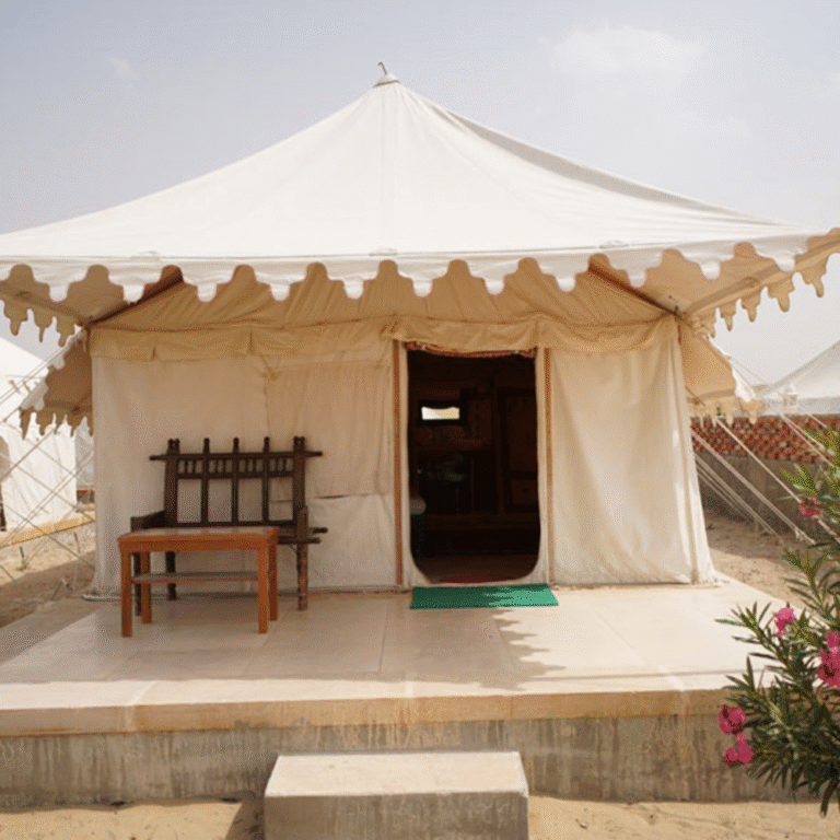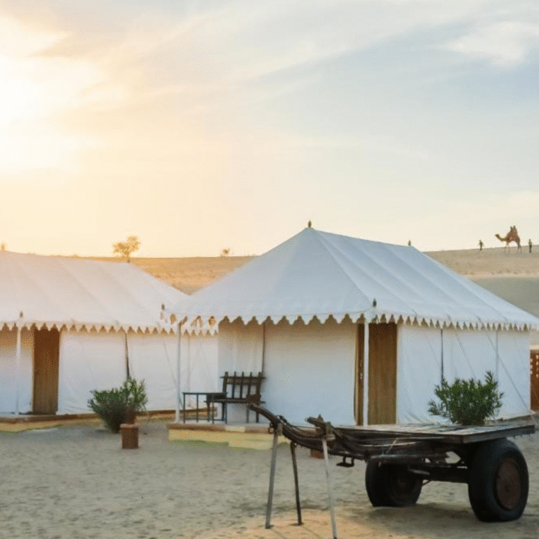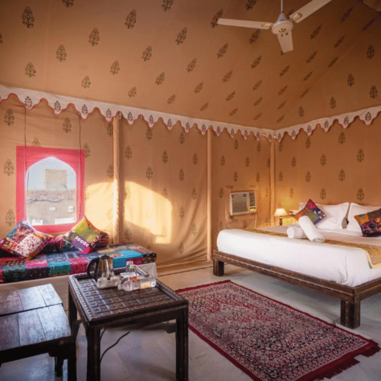 Our Super Deluxe Swiss Luxury Tents combine rustic desert charm with premium comfort. Featuring spacious interiors, elegant décor, and plush double beds draped in crisp cotton linens, each tent comes with a private modern washroom and thoughtfully designed amenities to ensure a truly luxurious desert stay.